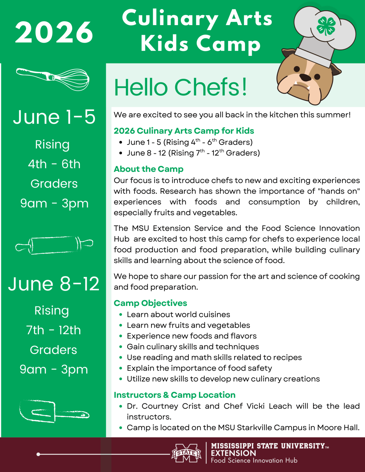 The MSU Extension Service and the Food Science Innovation Hub are excited to host this camp for chefs to experience local food production and food preparation, while building culinary skills and learning about the science of food.