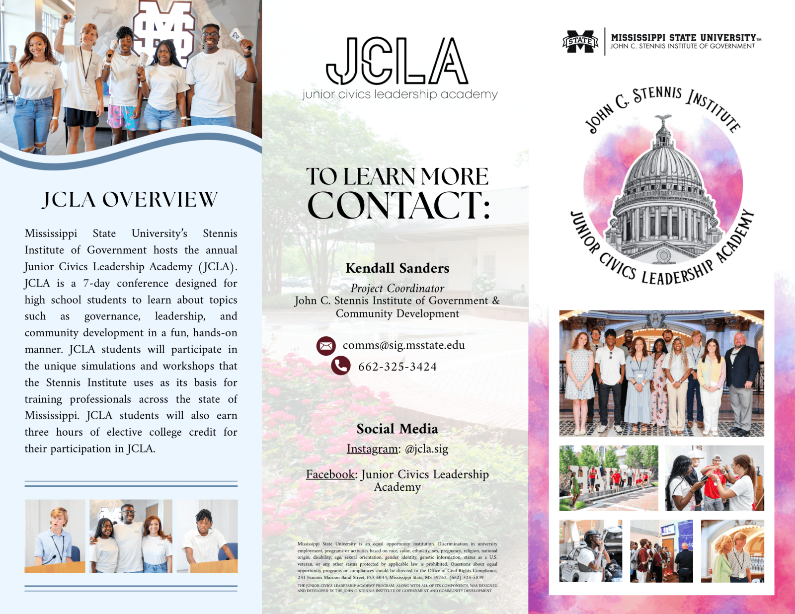 The Stennis Institute's “Junior Civics Leadership Academy” (JCLA) is a 7-day conference designed for high school students to learn about topics such as governance, leadership, and community development in a fun, hands on manner. In addition to enjoying the unique simulations and workshops that the Stennis Institute have used as their basis for training professionals across the state, JCLA students will also have the benefit of earning college credit at the same time!